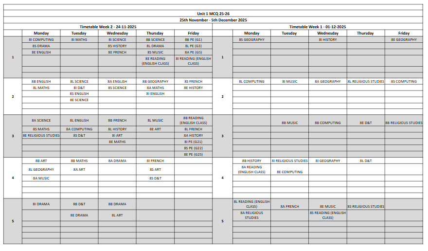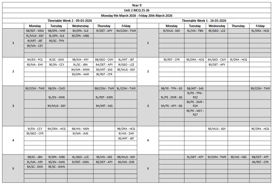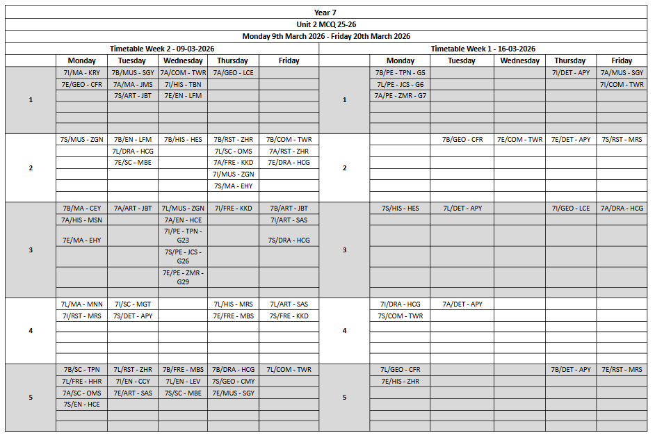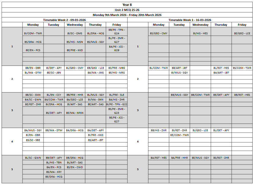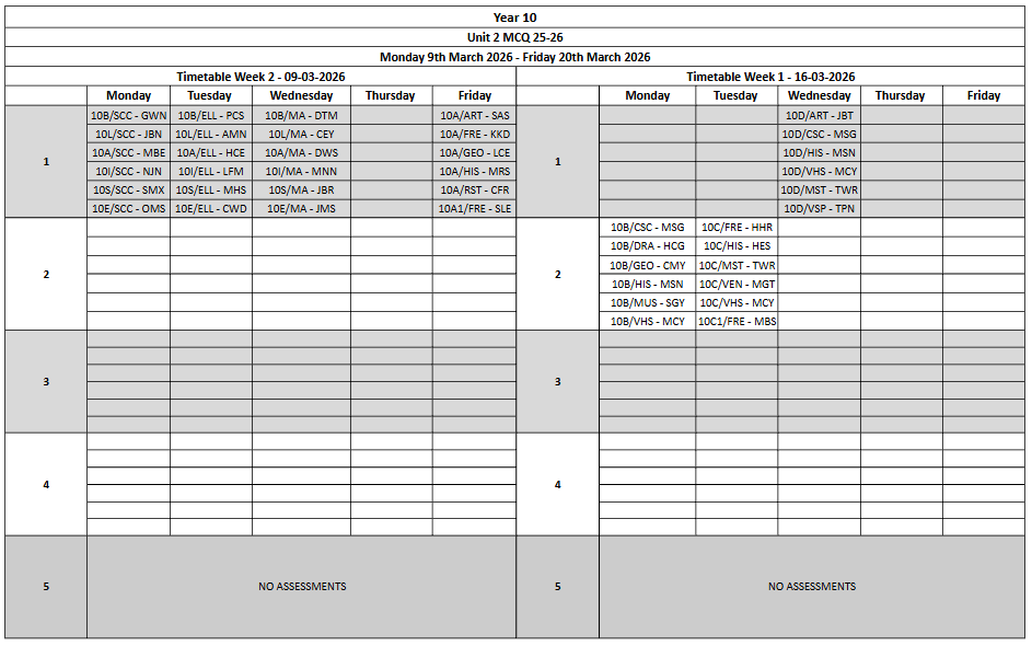 Please see the Unit 1 Assessment Timetables below: